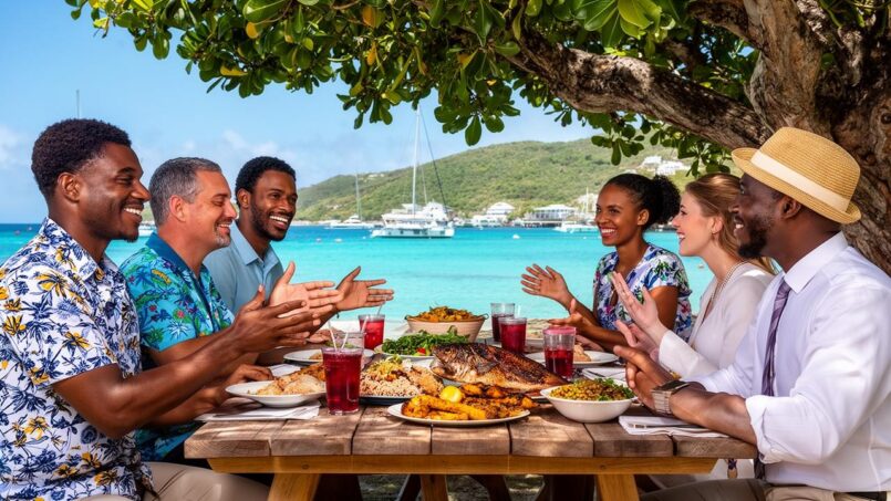 La cuisine des Îles Vierges britanniques est l’un des terrains où se perçoivent le mieux les influences croisées africaines, européennes, caribéennes et indo-asiatiques. Les plats emblématiques intègrent souvent du poisson, des fruits de mer, du maïs, des tubercules, des légumes-feuilles et des épices comme le curry, la muscade ou les mélanges « jerk ».