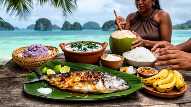 Pour illustrer une alimentation locale et saine : au petit-déjeuner, remplacer une partie du pain blanc par du taro rôti, de la patate douce ou du *tama* maison, accompagnés de fruits frais locaux. Au déjeuner, composer des bols avec du poisson grillé, du riz au coco ou du taro, et un mélange de légumes-feuilles sautés au gingembre et à l’ail. Au dîner, préparer une soupe de type tinola (poulet, papaye verte, gingembre, feuilles) ou un demok simplifié, en réduisant légèrement la quantité de lait de coco si l’on surveille ses lipides.