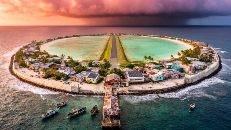 L’afflux de migrants internes depuis d’autres îles, cherchant emplois publics, services ou sécurité sanitaire pendant la pandémie, a accru la pression. Parallèlement, presque tous les grands projets d’adaptation (plateformes rehaussées, protections de berges, réaménagement du front de mer, extension vers le lagon) sont centrés sur l’atoll.